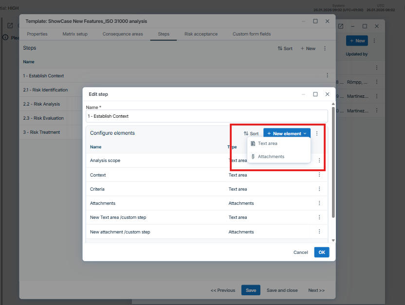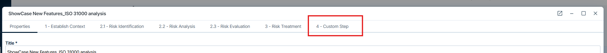 Wenn Sie dann eine neue Risikoanalyse erstellen oder eine bestehende bearbeiten, können Sie verschiedene Eigenschaften für das Risiko festlegen, z. B. einen Titel, die Version, eine Beschreibung und einen Ort, um sicherzustellen, dass es den richtigen Beteiligten angezeigt werden kann.