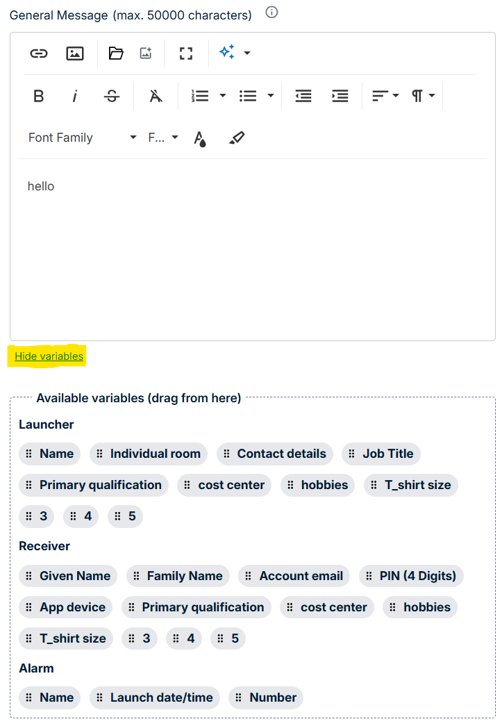 Unterhalb des Nachrichteneditors befindet sich ein Link Variablen anzeigen.