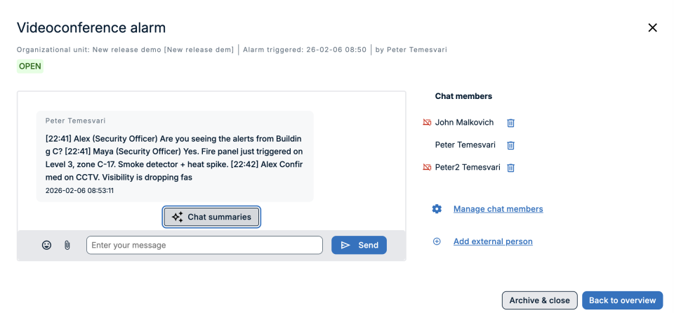 All chats for the triggered alarms will be shown. Once you click on the small black message tab, you are ready to take part in the conversation.