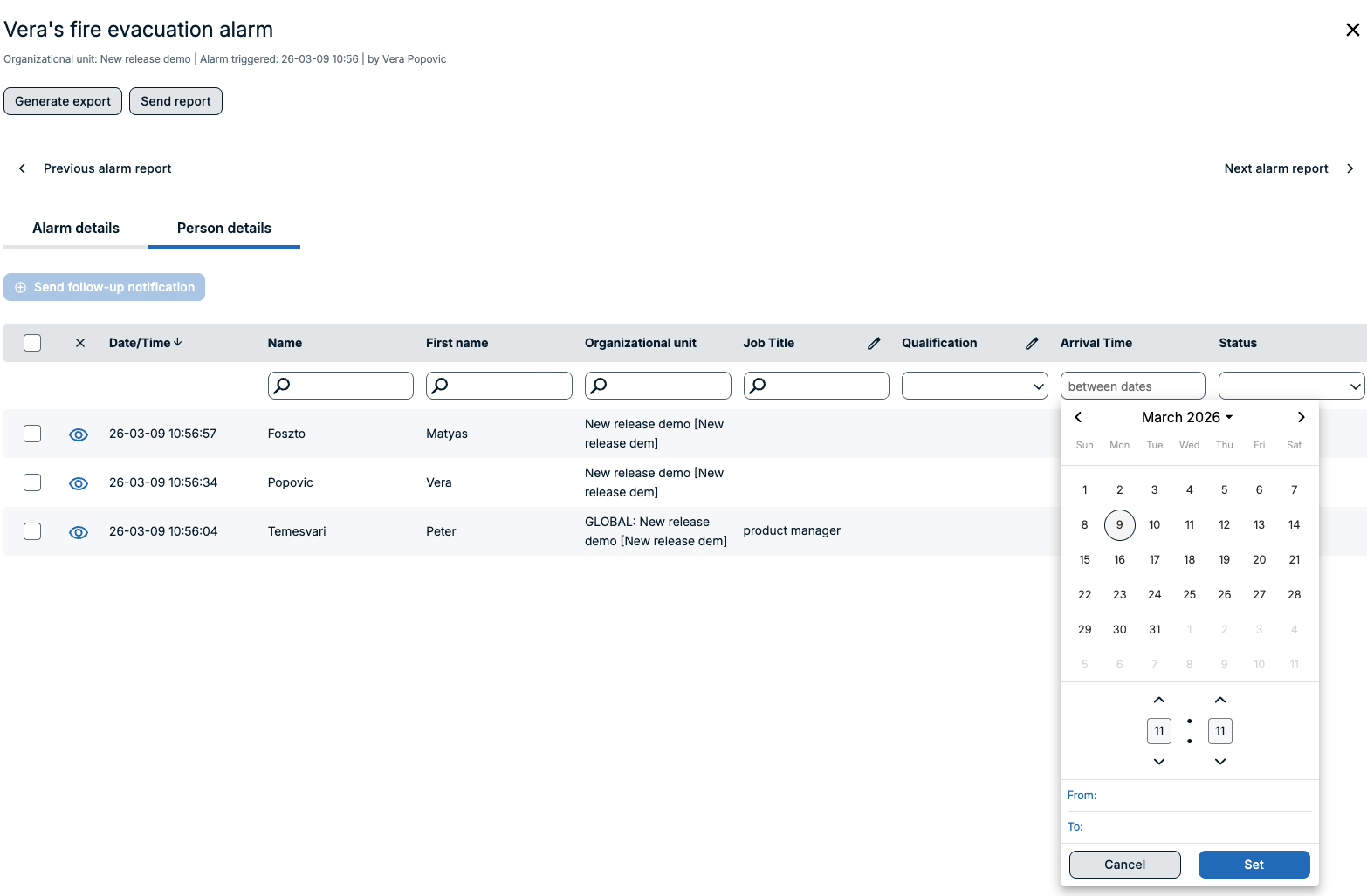 This makes it easier to filter and identify persons who responded to an alarm within a specific arrival time in minutes.