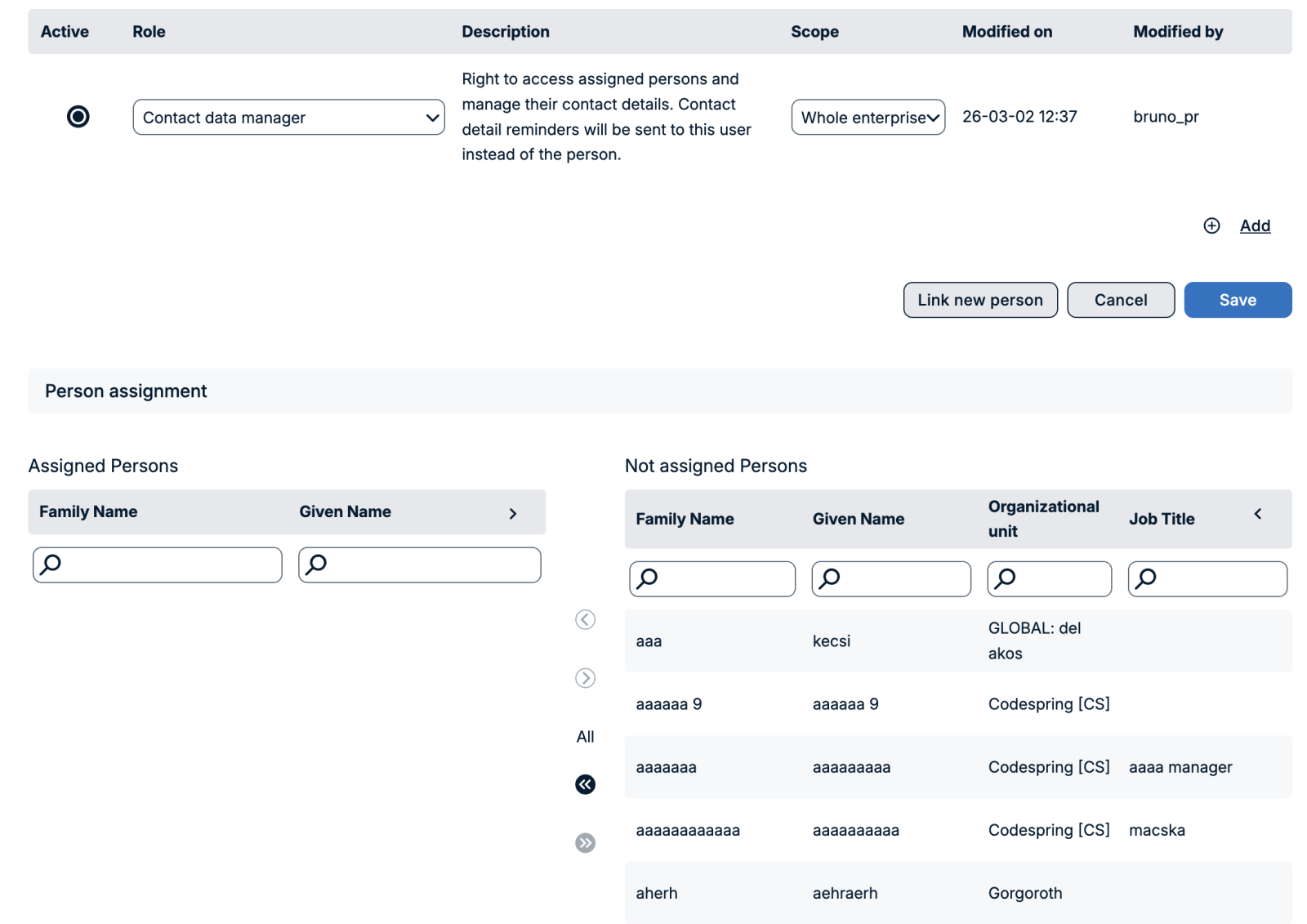 A person can have one assigned Contact Data Manager (which is a user) who is responsible for maintaining that person’s contact details.