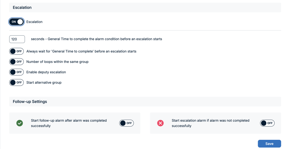 When navigating to the “Feedback and Escalation” tab in the alarm configuration, users must first configure and save the Feedback section. Once the Feedback section has been saved, the full Escalation section becomes visible and can be configured accordingly.