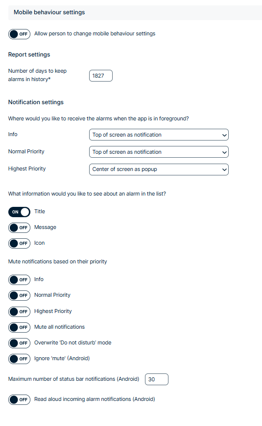 Puede permitir a los usuarios cambiar el comportamiento móvil activándolo en la configuración del comportamiento móvil. Esto le permite controlar la configuración de la aplicación ENS+ de forma aún más centralizada.