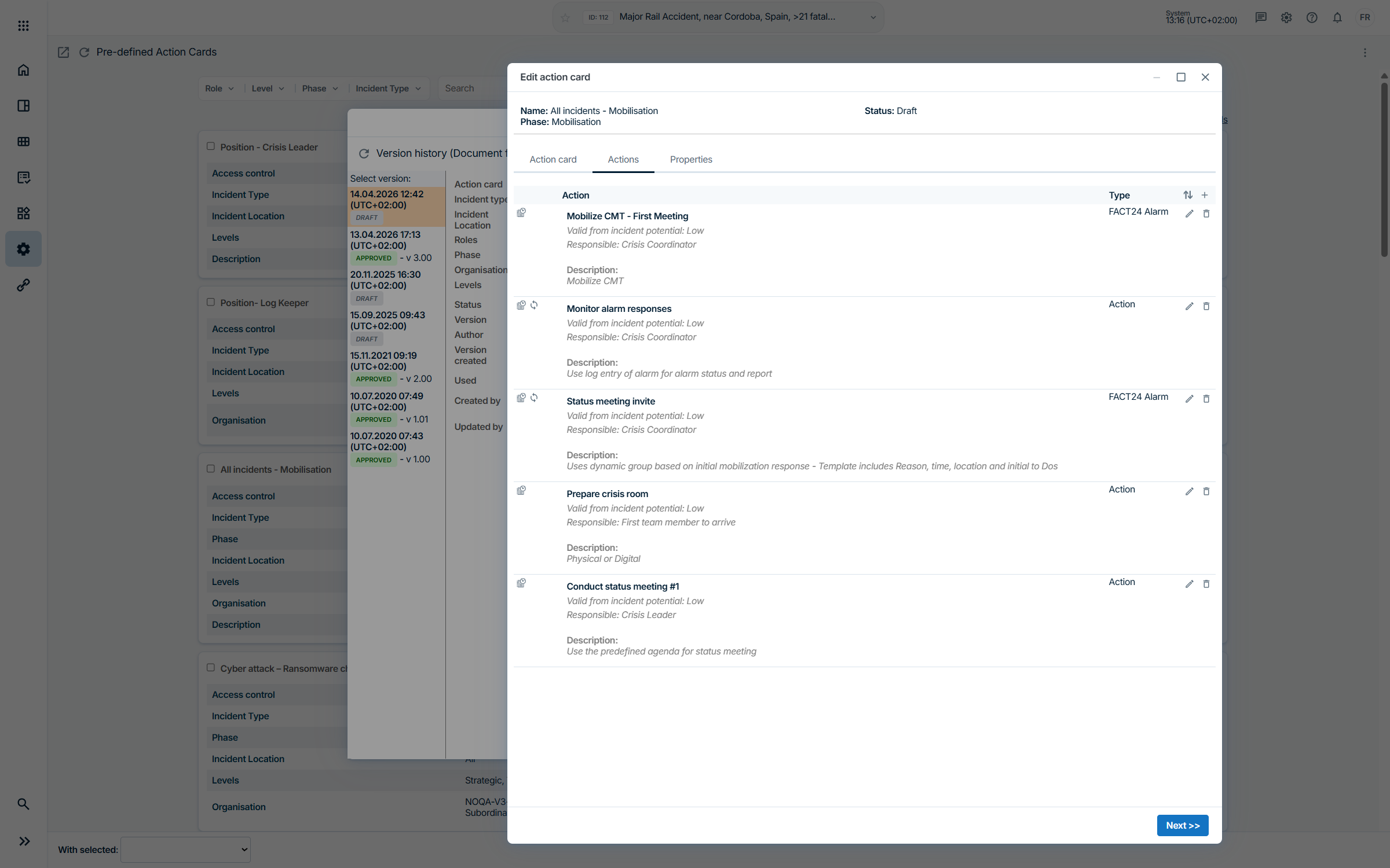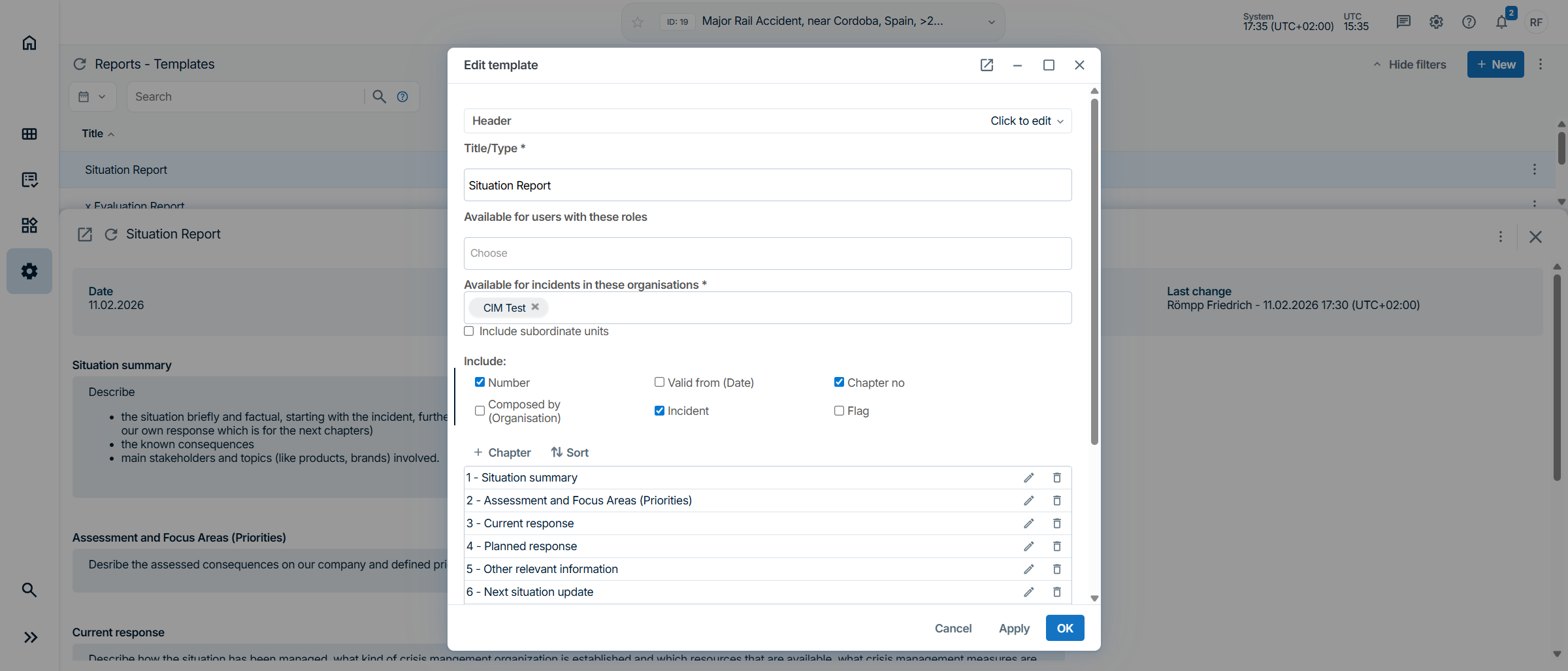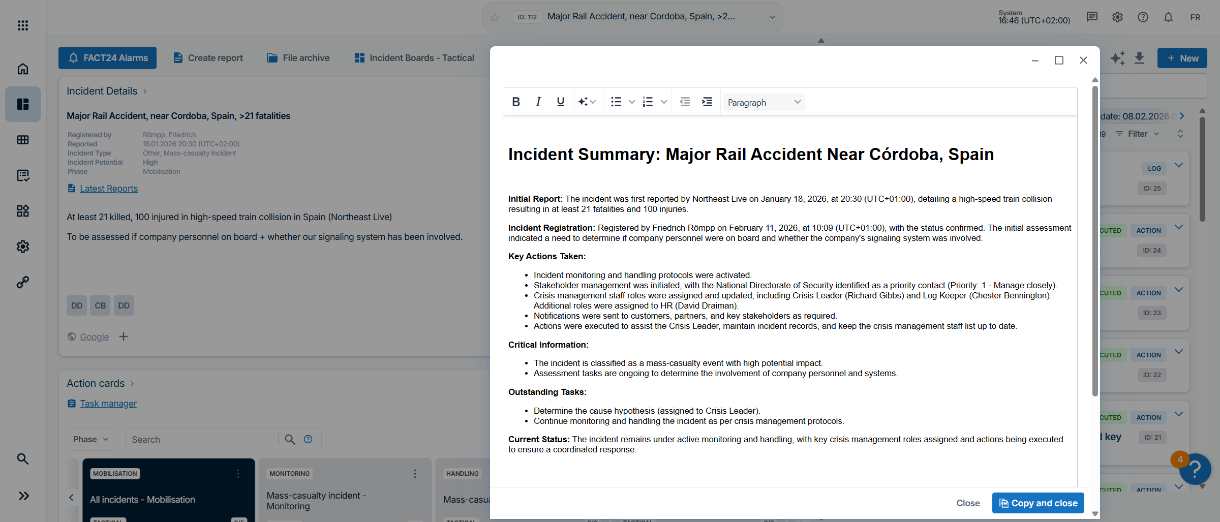 Durante las crisis, es necesario consolidar grandes cantidades de información proveniente de múltiples unidades para obtener una visión general clara de la situación. La elaboración de informes rápidos y fiables es fundamental para la toma de decisiones y la comunicación con las partes interesadas. El módulo de informes mejorado permite a los gestores de crisis generar rápidamente borradores de informes a partir de los datos disponibles mediante inteligencia artificial e instrucciones predefinidas. Además, facilita un análisis posterior a la crisis más rápido para la elaboración de informes posteriores a la acción y la recopilación de lecciones aprendidas.