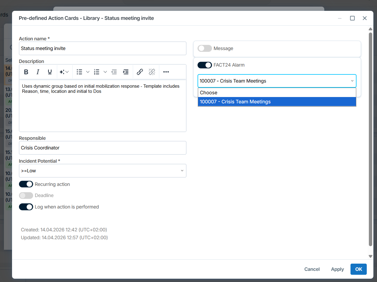 - Las acciones que utilizan alarmas se muestran como tipo “Alarma FACT24” y en las tarjetas de acción se muestra el icono de la campana de alarma.