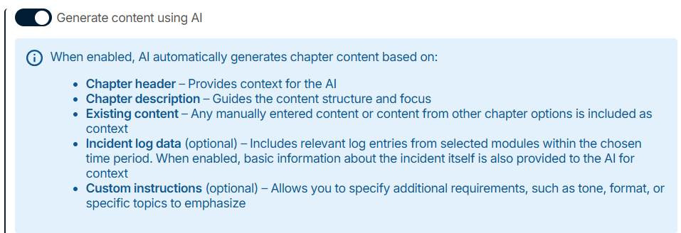 La descripción del capítulo define qué debería producir la IA a partir de los datos seleccionados. - Agregue instrucciones del cliente sobre el formato o el tono.