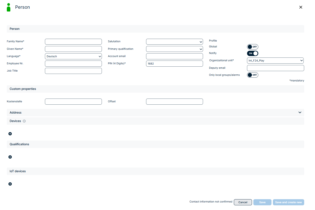 - IoT Devices : le système prend en charge l’affectation directe de dispositifs IoT tels que les boutons Bluetooth et les boutons d’urgence LORA en ajoutant leur ID Hardware. Si au moins un de ces appareils est attribué à une personne, un profil doit être sélectionné pour cette personne. Si le dispositif IoT transmet des informations de localisation, l’alerte attribuée est déclenchée. Si aucune géo-information ou si une géo-information inconnue est transmise au système, l’alerte par défaut configurée dans le profil sera déclenchée.