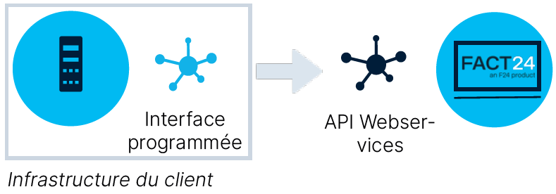 Nous proposons une API REST pour synchroniser les personnes et les groupes avec FACT24. La programmation de l’interface avec votre système doit être effectuée par vous-même ou par le fournisseur du système à connecter. Les frais d’installation de l’API du service web et les frais d’utilisation mensuels (inclus dans l’édition de base de FACT24 CIM) sont indiqués dans notre liste de prix. Recommandé à partir de 1 000 personnes.